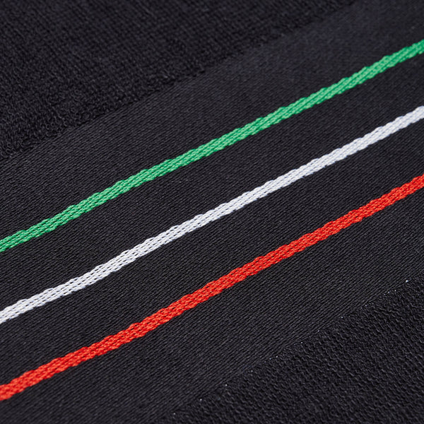 Terry towel suitable as a bench towel during gym workouts or as a ring towel. Made in black with an Italian flag and Leone 1947 logo.